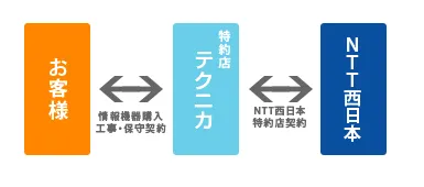 「NTT西日本特約店」は、NTT西日本と情報機器特約店契約を締結し、NTT西日本ブランドの情報機器の販売をはじめ、工事からメンテナンスサービスまで行っている信頼ある企業です。 NTT西日本特約店である当社は、契約時のトラブルを防ぐため、事前に下記の事項をお約束します。