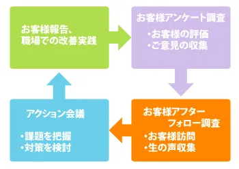 「お客様に感動を与える事が出来るようなサービスをご提供したい!」という思いから、お客様に安心・信頼していただける関係づくりを目指し、テクニカではCS(お客様満足)推進活動に取り組んでいます。 お客様を対象とするアンケート調査やインタビュー調査を行い、指摘された課題については、直ちに関係者とアクション会議を行い、CS改善サイクルを回しています。私たちは、お客様の永続的な発展のために、ともに考え、ともに行動し、改善活動を推進します。