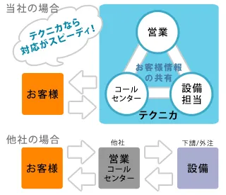 テクニカのなによりの強みは、販売・工事・アフターサービスを全て自社にて行える事です。お客様とのコミュニケーション窓口を統一することにより、煩雑になりがちな導入前の手続きや導入後のアフターケアを自社で行う事により、お客様のビジネスニーズに合わせた設備を円滑に導入する事が可能です。 また、お客様とのお取引のデータをしっかりと管理・蓄積しておりますので、「困ったな」という時の対応を迅速に行う事が出来ます。