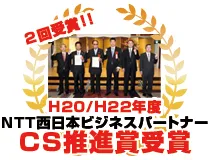 NTT西日本様より情報機器特約店年間表彰式にて平成20年度と平成22年度の2回、CS推進賞を受賞しています。 ※CSとは、Customer Satisfaction(カスタマーサティスファクション)のことで、お客様満足を意味します。 当社の取り組みが「お客さまサービスの向上に積極的に取り組み、 NTT西日本ブランドおよび、NTT西日本販売店としての信用拡大に貢献した」として、評価されたものです。 これからもより良いお客様満足度向上のため、日々研さんして参ります。